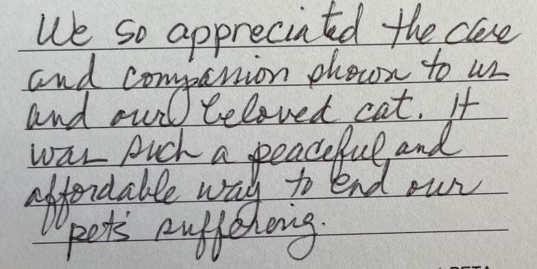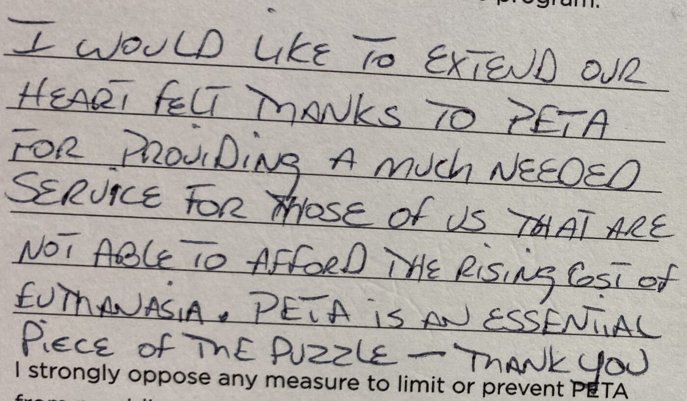 When the health of elderly cat Socks deteriorated and she lost her sight and stopped grooming herself, her guardian brought her to PETA’s shelter for free end-of-life services. She was among the 173 animals we euthanized this season at no cost to families who couldn’t afford this vital humane service. Their guardians filled out postcards asking their state legislators to safeguard our ability to offer end-of-life relief. This summer, 683 of our constituent families sent postcards to their elected officials in support of our services, including compassionate euthanasia.