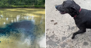 Dog Turns Bright Blue After Jumping Into Dyed Pond, Leaves Owner Laughing