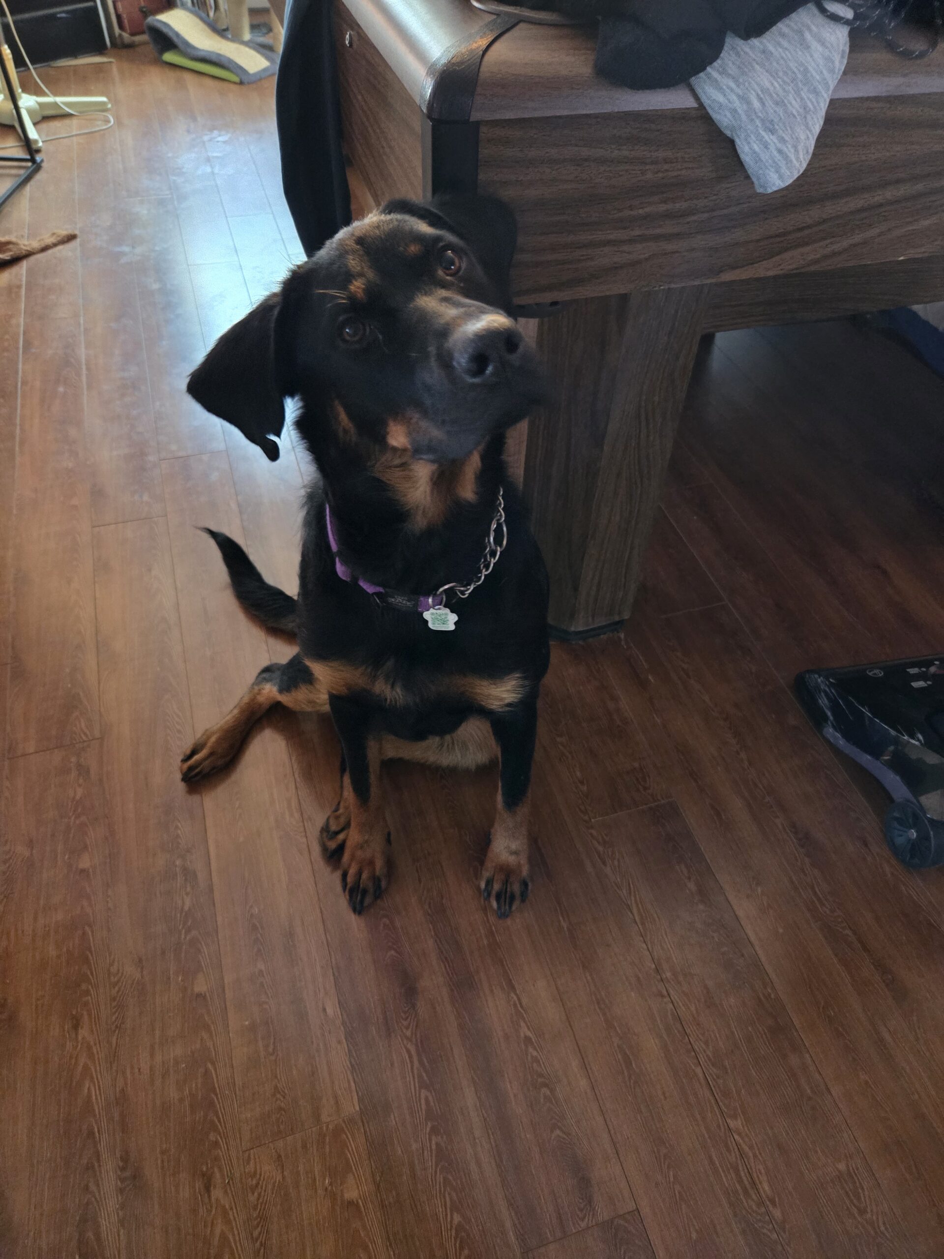 At just eight months old, the Rottweiler mix sisters had spent most of their early lives outdoors, so adjusting to indoor life proved challenging. Our team lovingly named the pair Bonnie and Miss Clyde. While Bonnie quickly found her footing and was adopted, Miss Clyde struggled with the unfamiliar – things like stairs, car rides, and house-training were overwhelming.